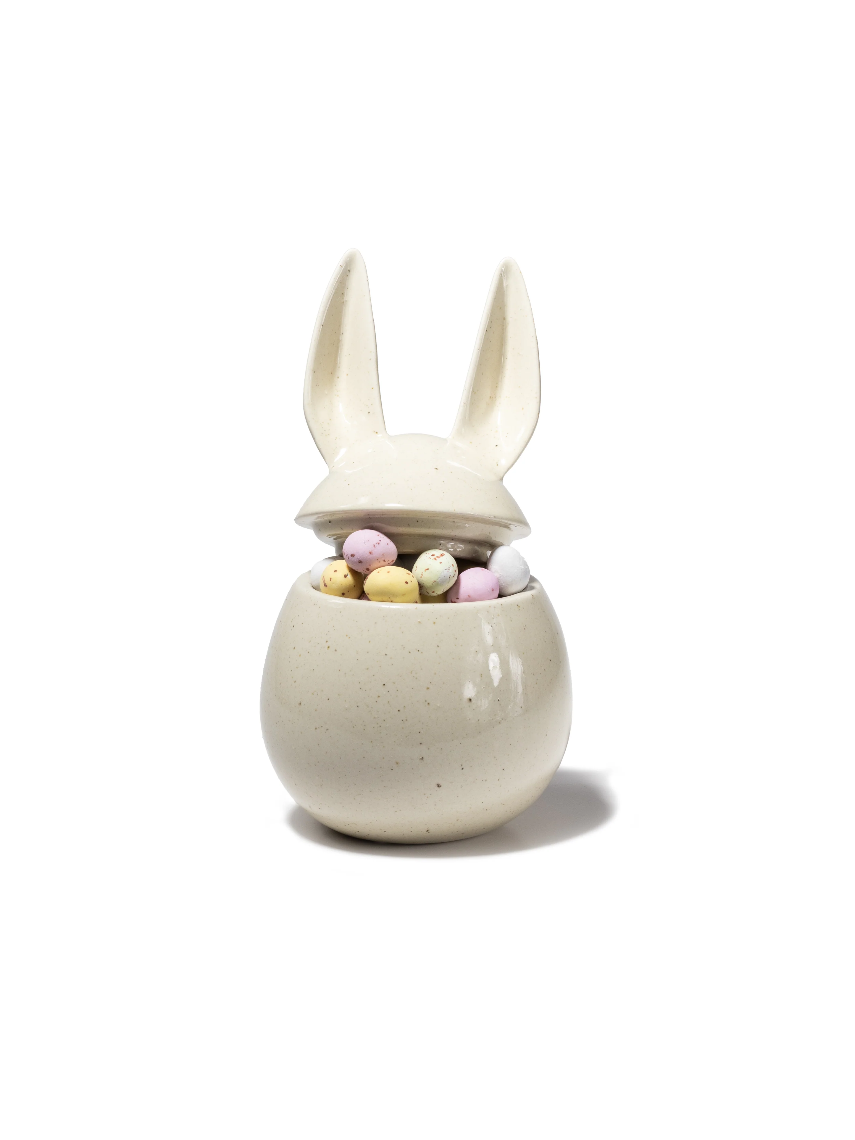 "Klassiker, i många år framöver. Från DBKD kommer produkter som både fungerar som stiliga godisbehållare och vackra inredningsdetaljer. Eating Rabbit är ett sött påskägg i keramik, fyllt med antingen krämiga nougatägg i folie, krispiga mjölkchokladägg med sockerskal eller an av våra favoritmixar. Som tillval kan du även köpa till ett påskkort med att skicka med en personlig hälsning på. Välj kort tryckta med vårt påskmotiv där tryck av din logotyp och hälsning ingår eller designa ert eget."